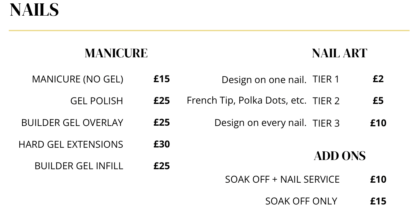 Please note our Price Lists may vary with Length of hair, amount of product used, any Nail Art etc!